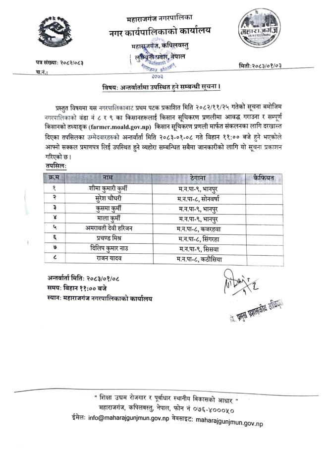 अन्तर्वार्तामा उपस्थित हुने सम्बन्धी सूचना (किसान सुचीकरण)