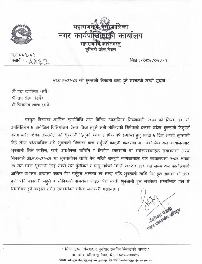 आ.व. २०८१।८२ को भुक्तानी निकासा बन्द हुने सम्बन्धी जरुरी सूचना