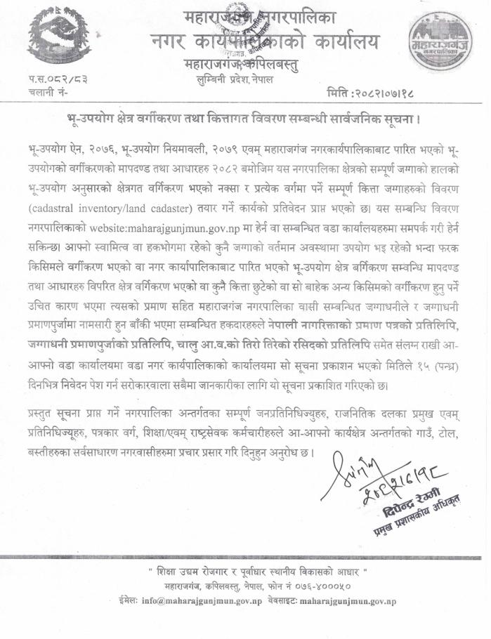 भू-उपयोग वर्गीकरण तथा कित्तागत विवरण सम्बन्धी सार्वजनिक सूचना